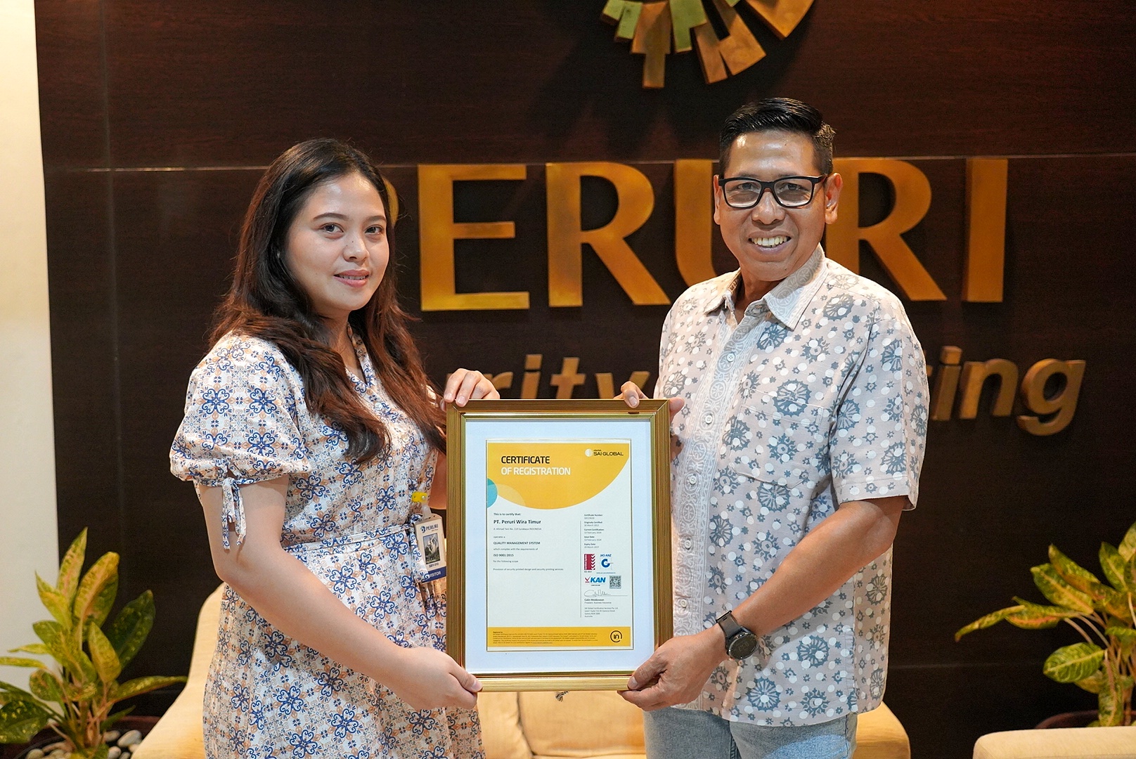 Peruri Security Printing melakukan kegiatan serah terima resertifikasi ISO 9001:2015 dari lembaga Intertek SAI Global Indonesia di kantor PSP di Jalan Ahmad Yani,Surabaya. Kegiatan ini dihadiri oleh Direktur Utama PSP Ahmad Hidayat dan Jesi Trilia Sovani Account Executive Intertek SAI Global.